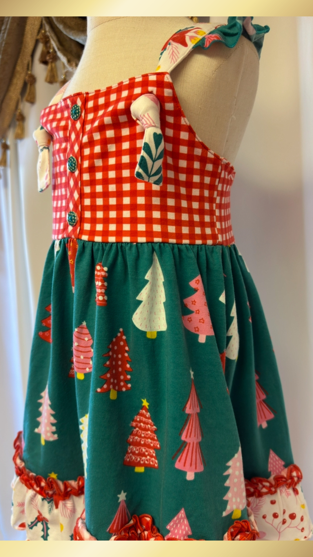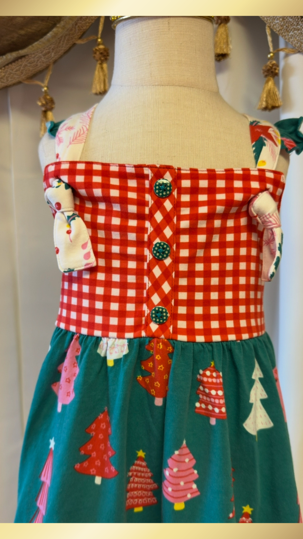 Tiene ese encanto navideño que mezcla lo clásico con lo divertido. El estampado de arbolitos, los botones verdes y el toque de cuadros rojos lo hacen perfecto para una colección festiva de Shine & Bloom Girls Boutique. 95% algondón y 5 % spandex