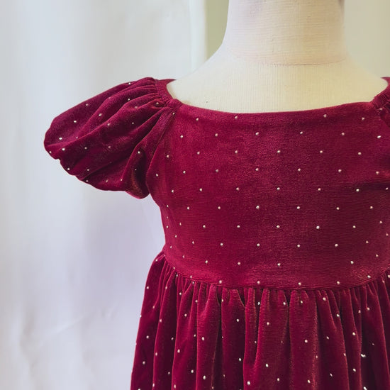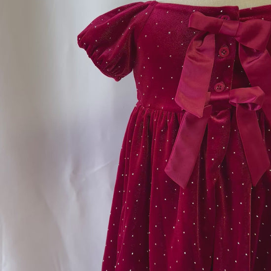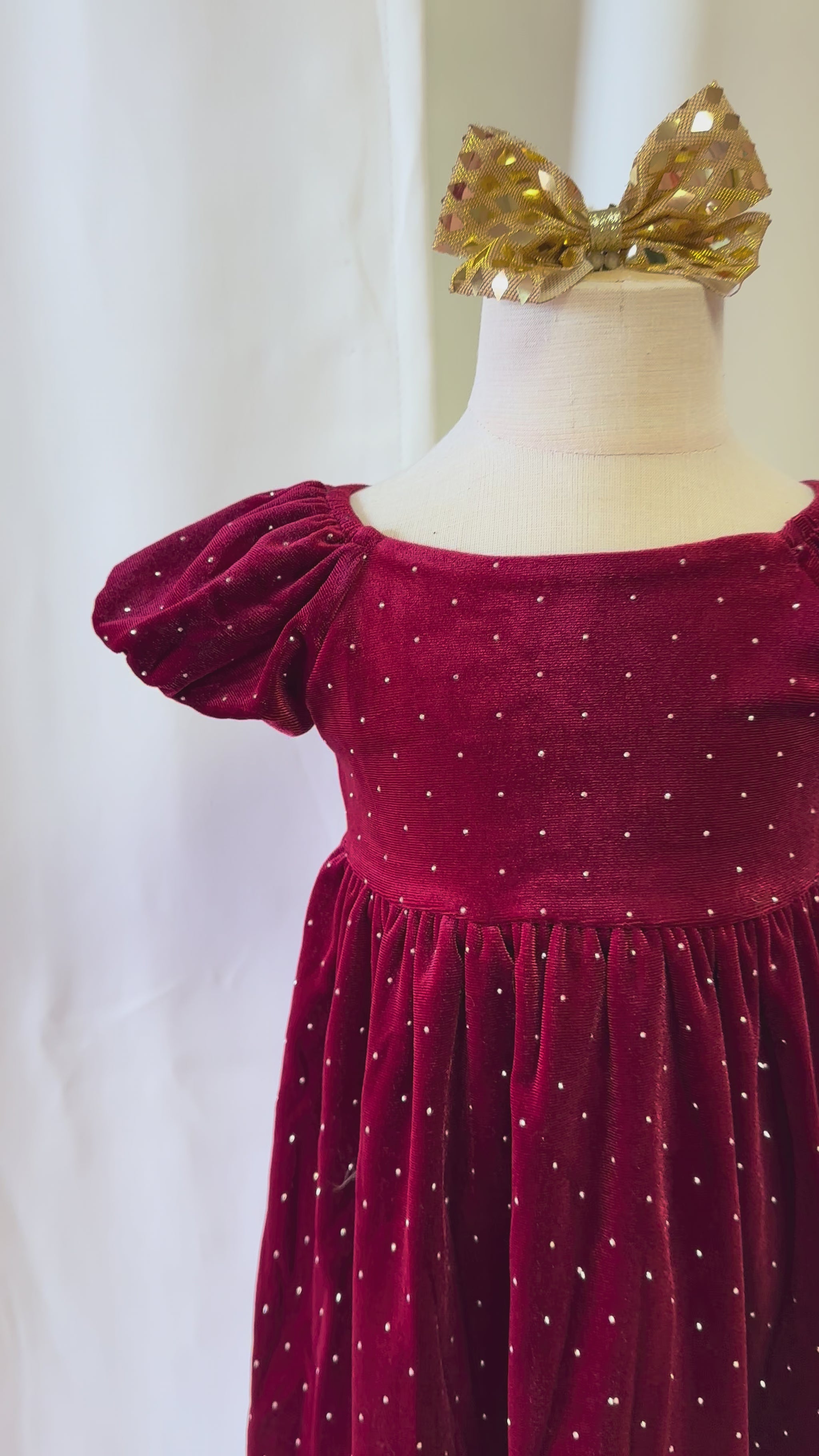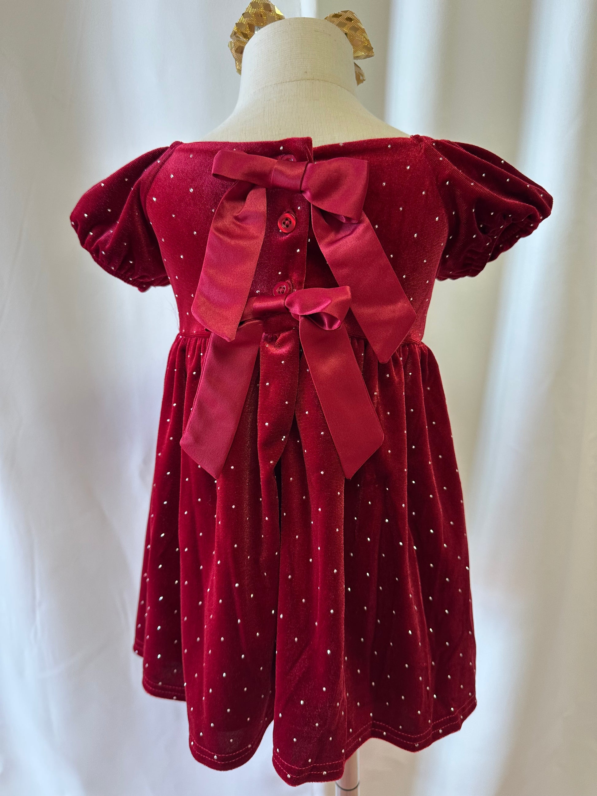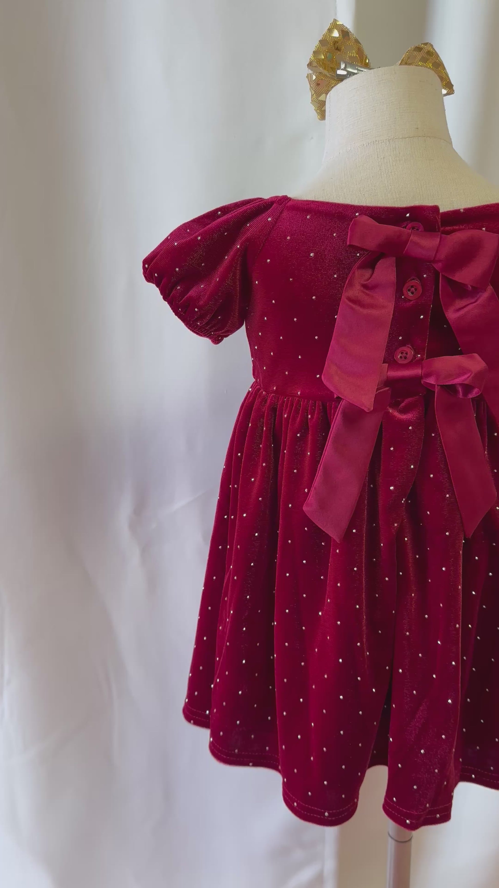 Un vestido de ensueño en terciopelo rojo profundo, delicadamente adornado con destellos que brillan como pequeñas estrellas. Suave, cómodo y perfecto para ocasiones especiales, este diseño incluye mangas abullonadas y un lazo doble espectacular en la espalda que añade un toque clásico y encantador.